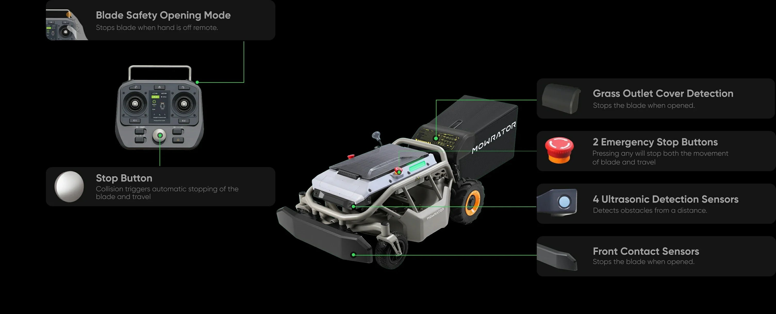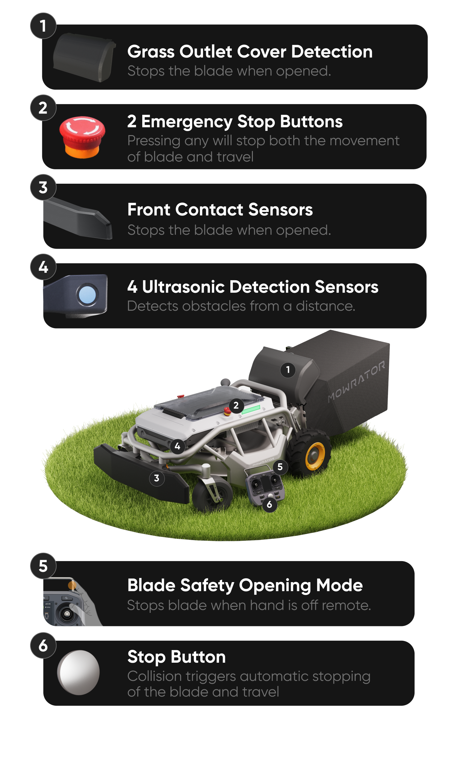From the bumper collision protection of the S1 front to 4 ultrasonic sensors on both sides, remote control emergency stop, anti-misoperation design, tilt protection, and safety alert reminders, our five-layer safety system detects obstacles, people, and pets in real-time, ensuring an immediate stop and all-around protection for your safety.