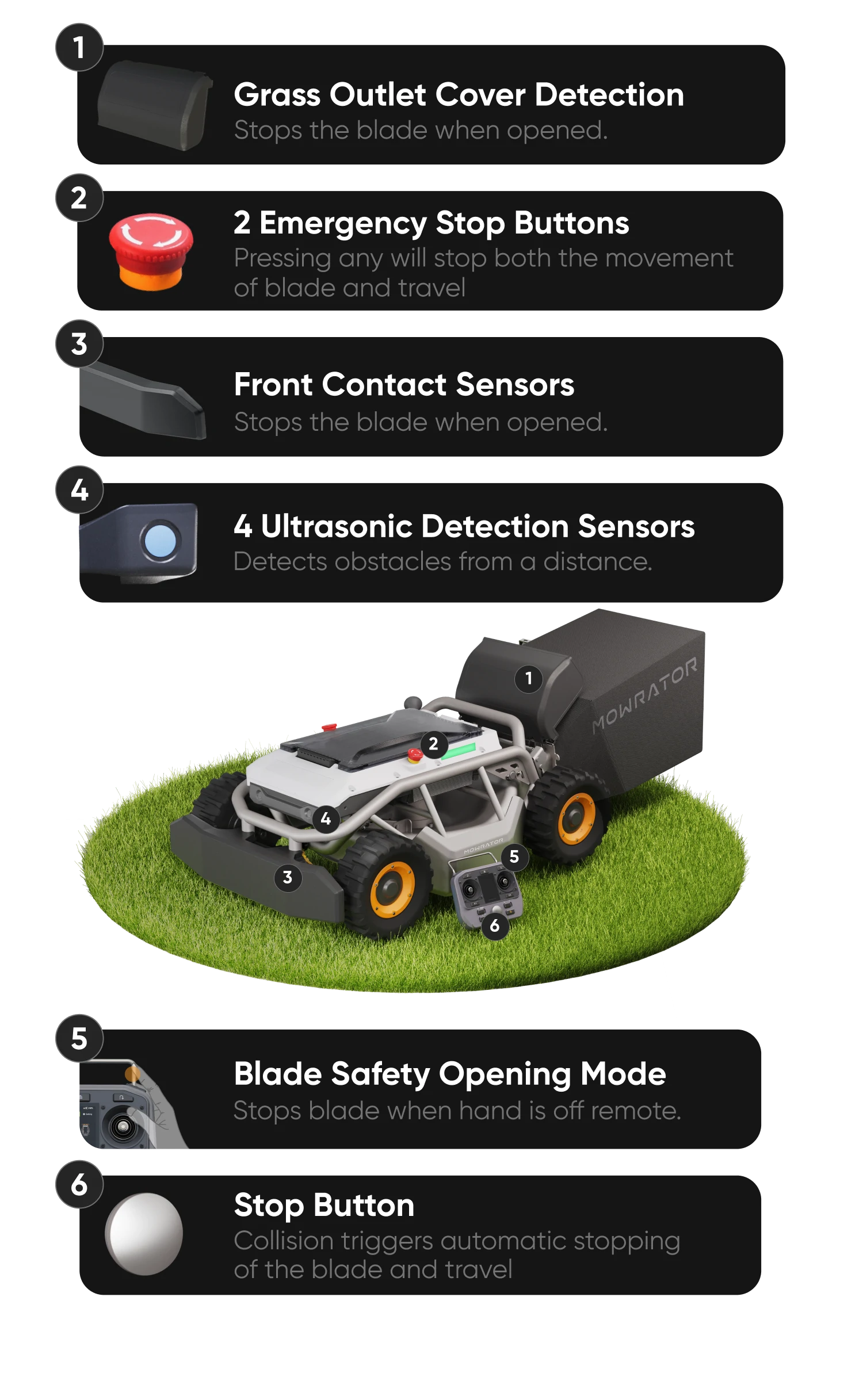 From the bumper collision protection of the S1 front to 4 ultrasonic sensors on both sides, emergency stop, anti-misoperation design, tilt protection, and safety alert reminders, our five-layer safety system detects obstacles, people, and pets in real-time, ensuring an immediate stop and all-around protection for your safety.