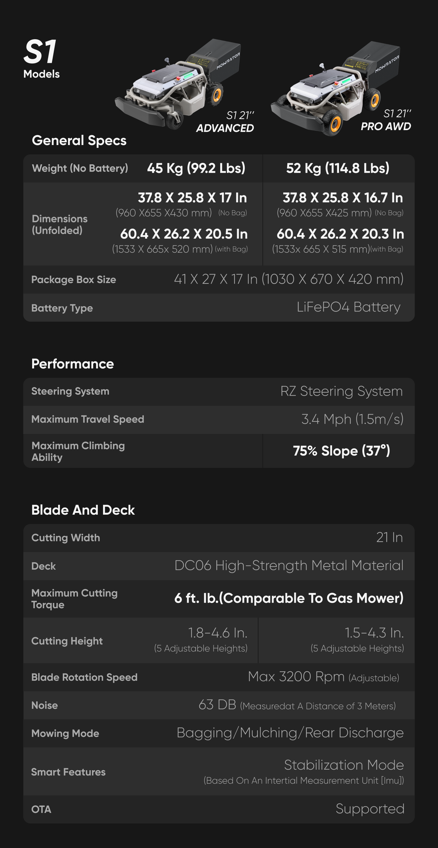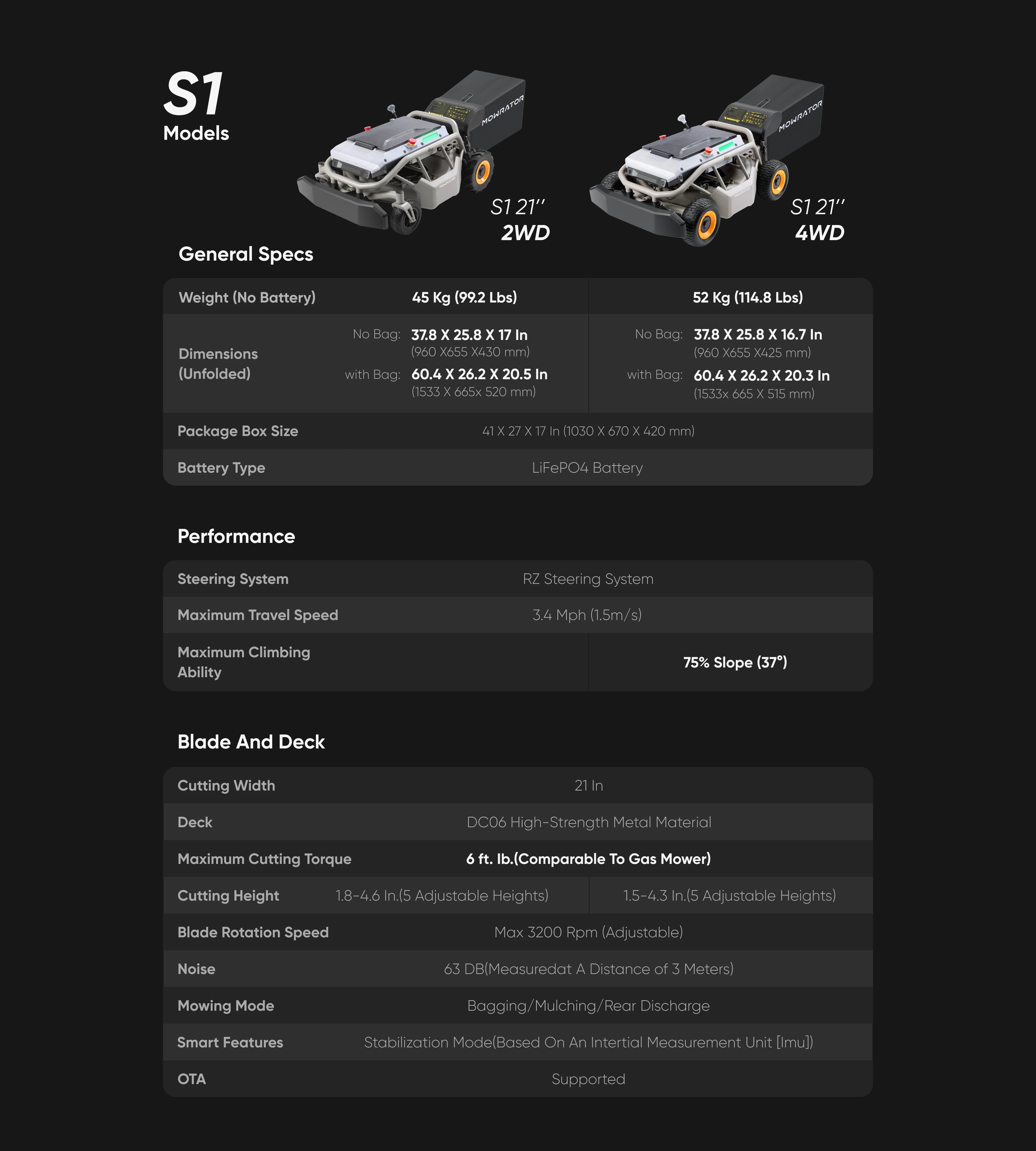 The Mowrator S1 features a 21-inch deck and 1600W gasoline mower-level cutting power. The combination of the blade and airflow design creates strong suction, lifting and cutting even thick grass evenly- St. Augustine grass, known for its toughness, is easily handled and neatly trimmed.